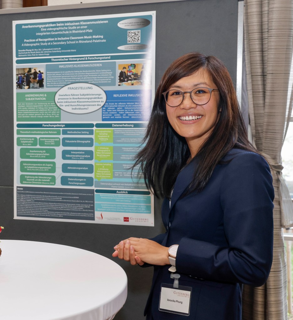 During my studies in music education, I came into contact with research-based learning, particularly through my work as a student assistant in the third-party funded project “Mannheim Music Education Model (M3)” at the Mannheim University of Music and Performing Arts (2015/2016) led by Prof. Dr. Martina Krause-Benz. In addition, together with a fellow student, I conducted an interview study on learning motivation in music lessons, supervised by Anne Steinbach and Michael Göllner, which was later published (Phung & Kurz, 2017, see below). This experience keeps motivating me until today to teach research-based learning as a bridge between science and teaching practice in school and university contexts.